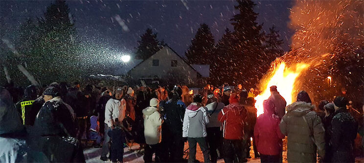 Zum bereits siebten Mal fand das traditionelle Neujahrsfeuer am Krummen See in Vogelsdorf statt und doch war es eine Premiere, zumindest was das Wetter anging. Im allerschönsten Schneegestöber wurde um 15 Uhr das Feuer entzündet.