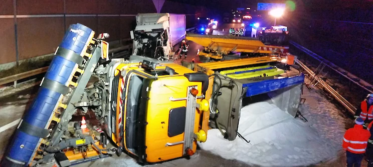 Zu einem schweren Verkehrsunfall zwischen einem LKW und einem Winterdienstfahrzeug kam es am späten Nachmittag des 17. Januar auf der Bundesautobahn 10 zwischen den Anschlussstellen Berlin-Hellersdorf und Berlin-Marzahn. Aus noch ungeklärter Ursache fuhr ein Sattelzug auf ein vorausfahrendes Streufahrzeug der Autobahnmeisterei auf.