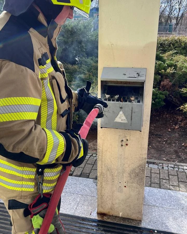 Ein Mülleimer für Zigaretten qualmte in der Nähe des Eingangs zu einem öffentlichen Gebäude.