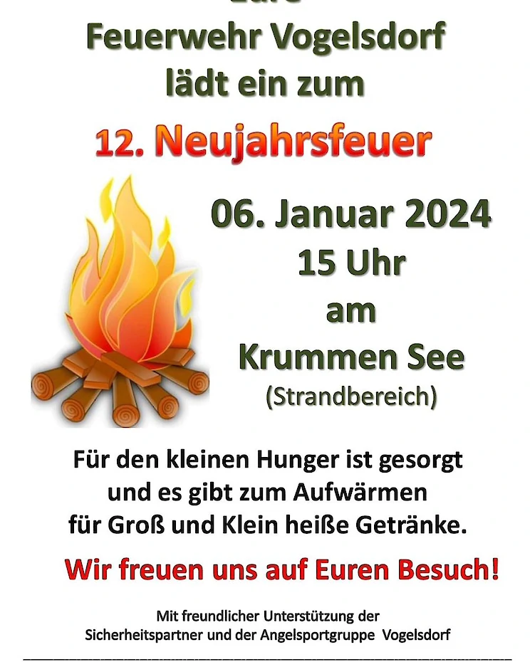 🔥 Zum traditionellen Neujahrsfeuer laden die Kameradinnen und Kameraden aus Vogelsdorf am Samstag den 6. Januar ab 15 Uhr herzlich ein.