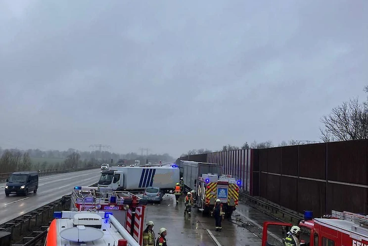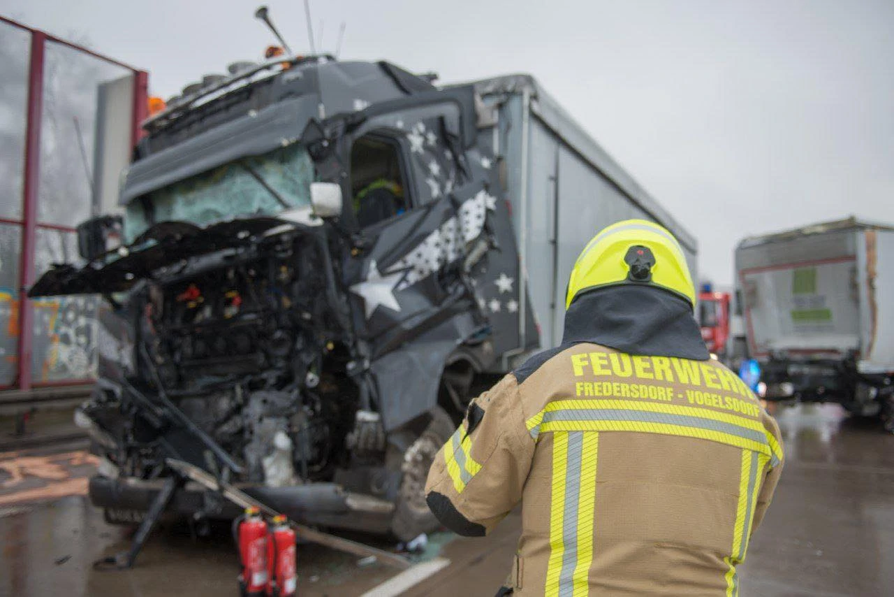 Bei dem Folgeunfall, waren zwei LKW im Stauende ineinander gefahren. Der Unfall war so schwer, dass beide Fahrer verletzt wurden. Gemeinsam mit der Feuerwehr Rüdersdorf befreiten wir einen eingeklemmten Fahrer.