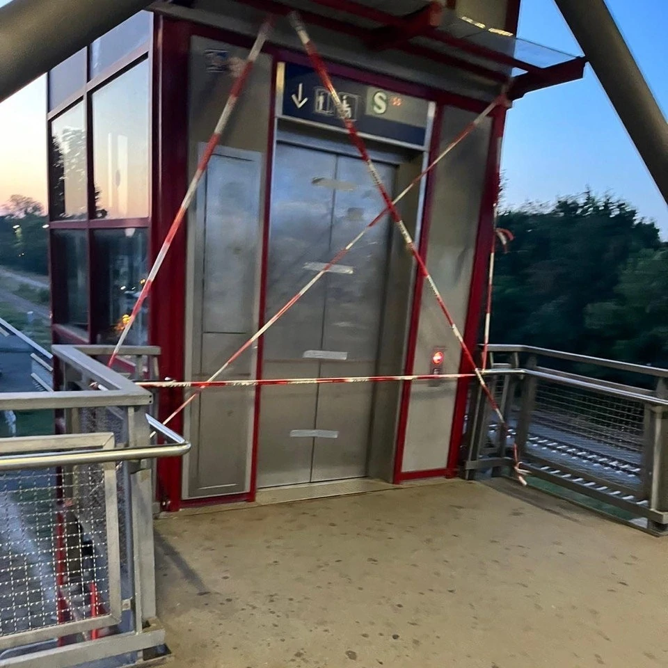 Die zweite Alarmierung des Tages führte uns zum Bahnhof. Dort waren mehrere Personen im Aufzug eingeschlossen. Da der Aufzug stark beschädigt war, mussten wir die Aufzugstür mit unserem Spreizer öffnen und die Personen befreien.