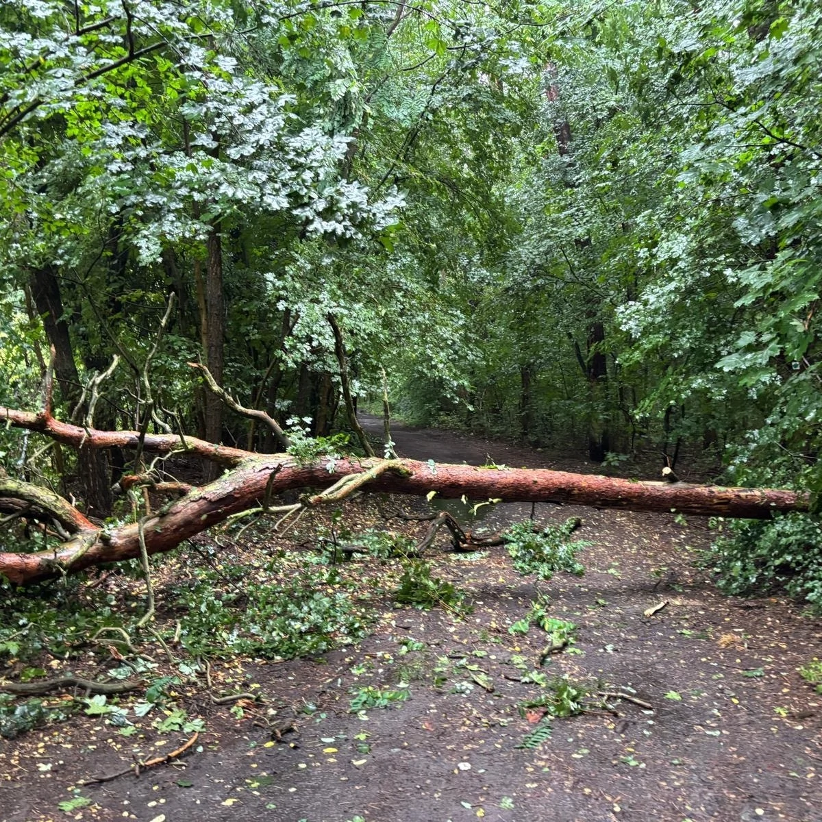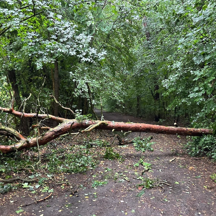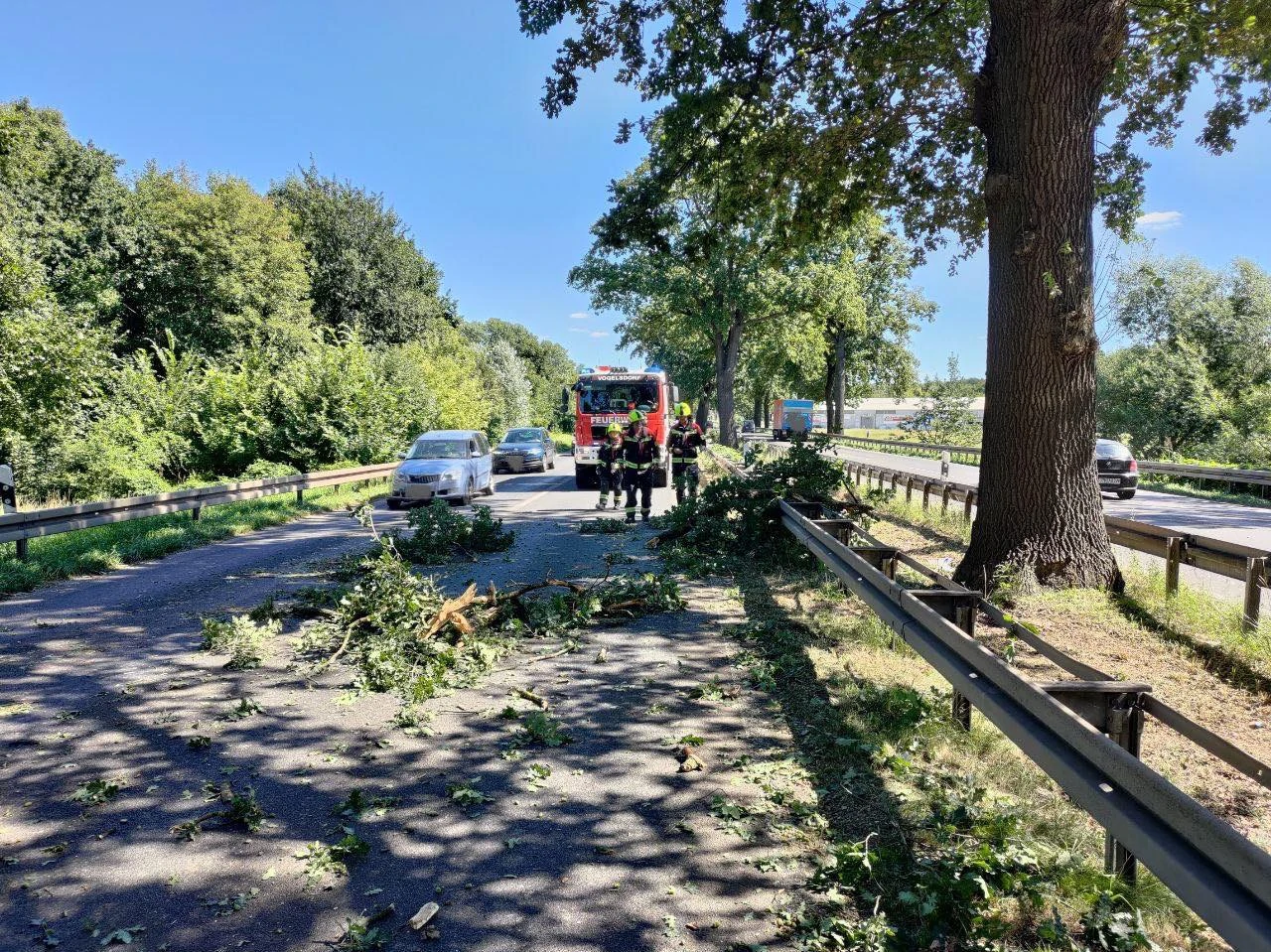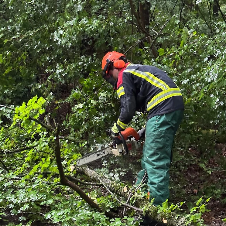 Ein Baum blockierte die Straße. Wir beseitigten ihn per Kettensäge. Zwei weitere Bäume wurden ebenfalls entfernt.