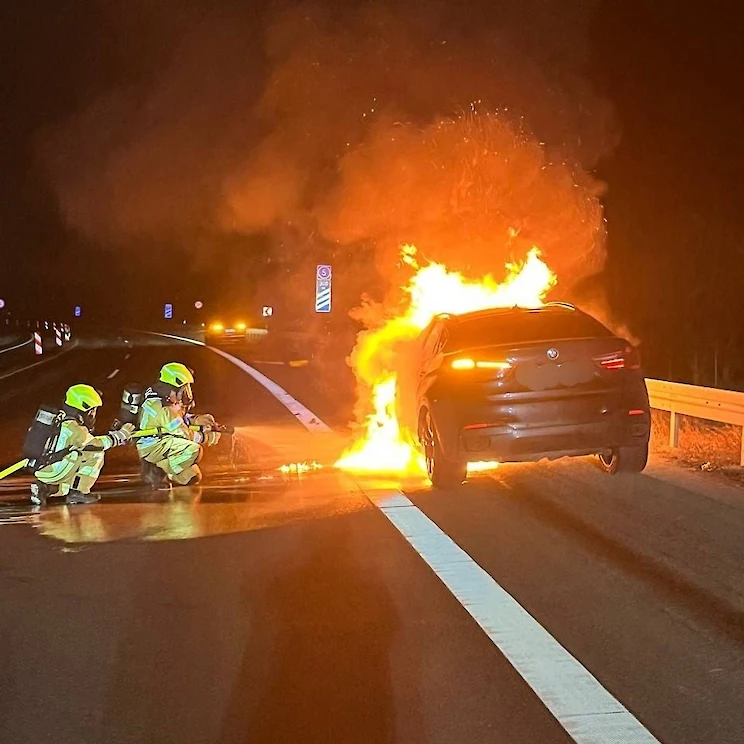 Aus ungeklärter Ursache entstand bei einem BMW während der Fahrt ein Feuer. Der Fahrer fuhr auf den Standstreifen. Bei unserem Eintreffen stand das Fahrzeug bereits im Vollbrand. Wir löschten den Brand und übergaben danach die Einsatzstelle der Polizei.