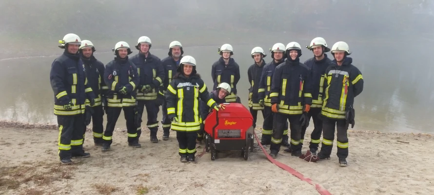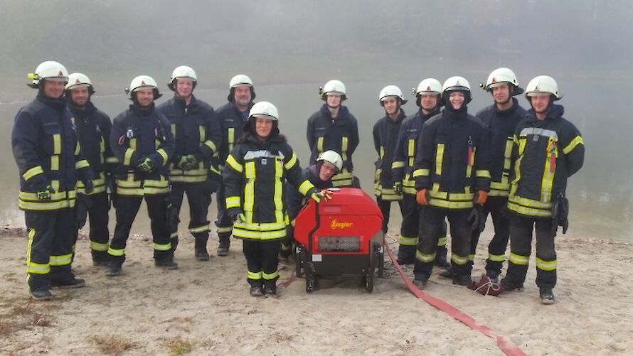 Freude über die 13 frisch ausgebildeten Maschinisten für Löschfahrzeuge, die in mehreren Wochenendschulungen alles über Feuerlöschkreiselpumpen, Löschwasserförderung und vieles mehr gelernt und anschließend praktisch geübt haben. Dabei müssen die Handgriffe sitzen, egal ob das Wasser aus dem Tank im Löschfahrzeug, aus einem Hydranten am Straßenrand oder, wie im Bild zu sehen, mit einer mobilen Pumpe aus einem öffentlichen Gewässer bezogen wird. Gut ausgebildete Maschinisten sind unverzichtbar für erfolgreiche Feuerwehreinsätze. Denn sie sind es, die immer für ausreichend Wasser am Strahlrohr sorgen.