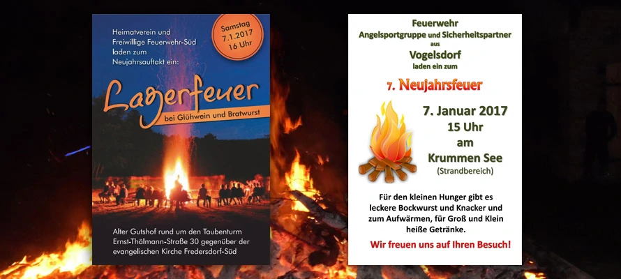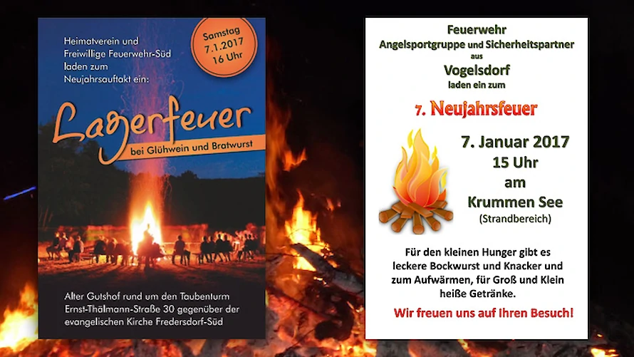 Zur schönen Tradition sind die Feuer zu Beginn eines neuen Jahres in den Ortsteilen Fredersdorf-Süd und in Vogelsdorf geworden. Hier kommen Nachbarn und Freunde zusammen um bei einem Becher Glühwein und netten Gesprächen gemeinsam das neue Jahr zu begrüßen.
