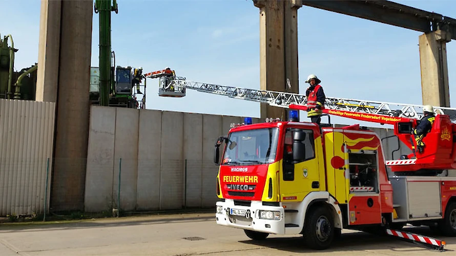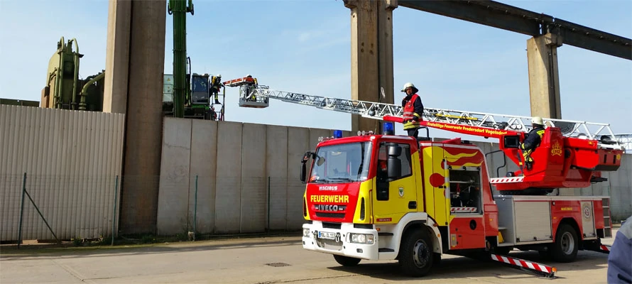 Es ging zu einem größeren Gewerbebetrieb in die Industriestraße nach Vogelsdorf. Hier wurde der Brand an einer großen Maschine simuliert. Zwei Personen waren in Gefahr, eine im Führerstand der Maschine, eine im Führerhaus eines nahe gelegenen großen Baggers.